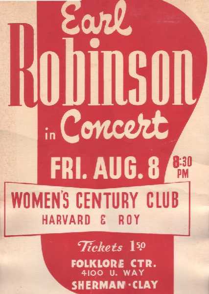 Bob Nelson recently loaned me a collection of posters of folk music concerts in Seattle in the early 1950s. I posted them on the web site of the Pacific Northwest Folklore Society. One of these posters caught my attention – Earl Robinson, in Concert, Friday, August 8, 1953, at the Women’s Century Club, Harvard & Roy, Seattle. It seemed I should know who he was, but I really didn’t.